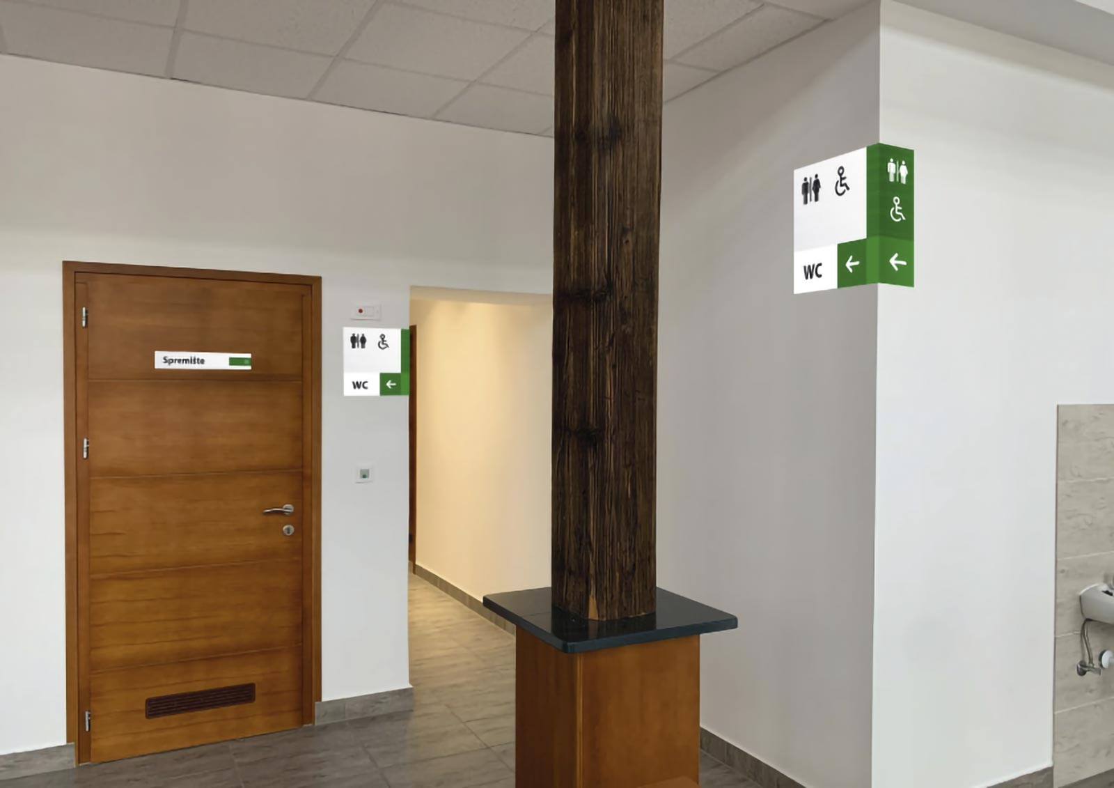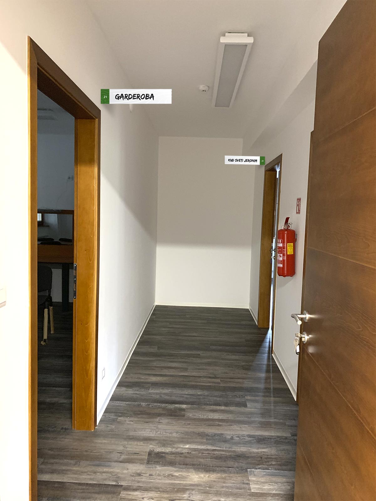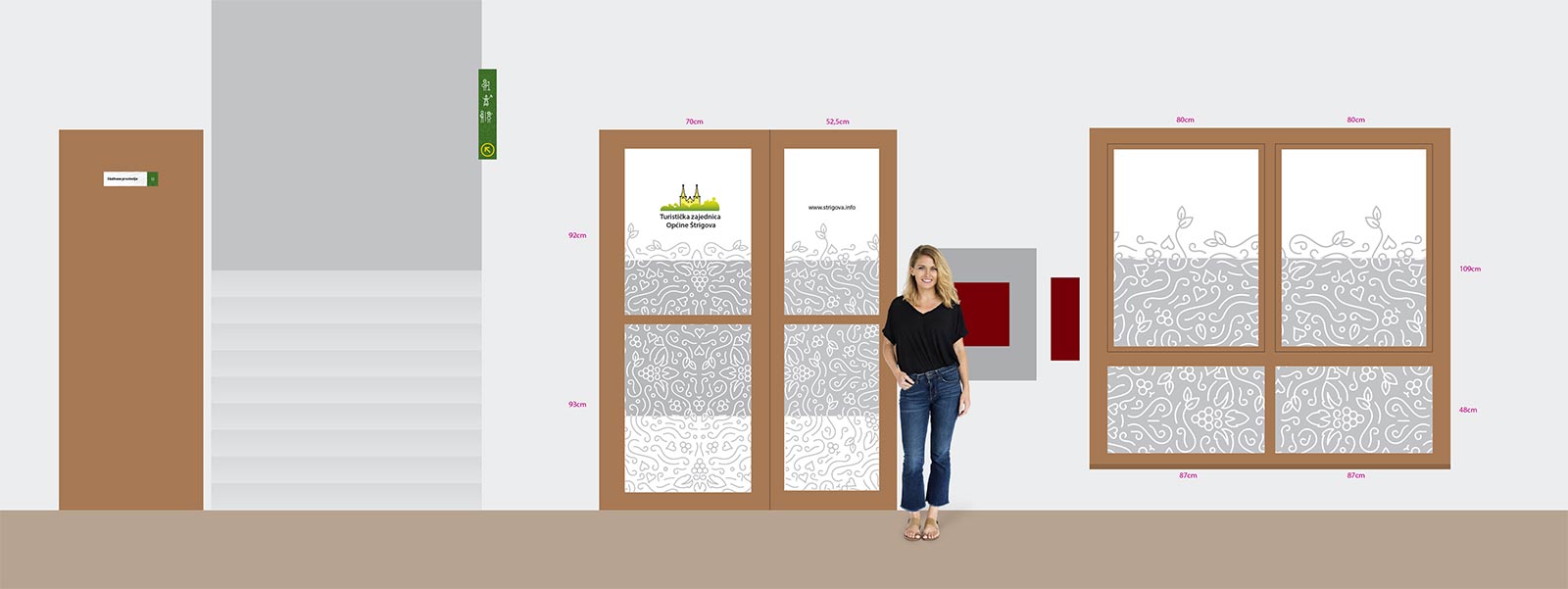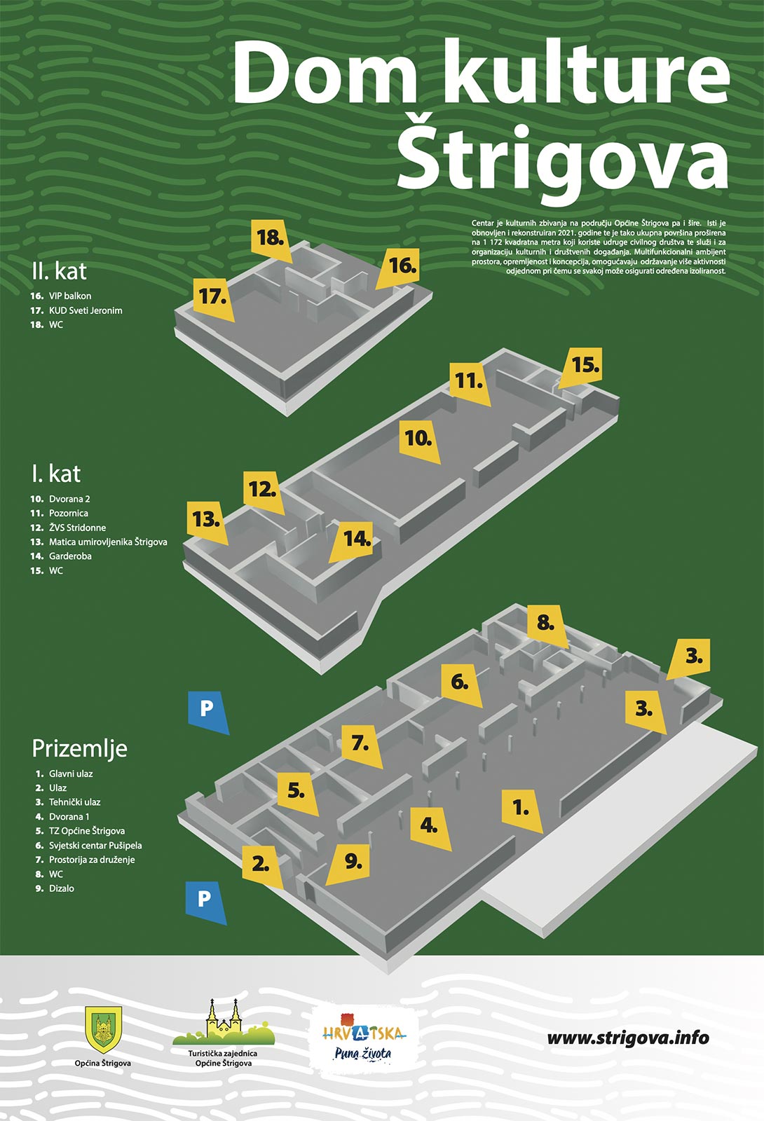 We developed the complete wayfinding and labeling system for the Culture Home Štrigova (Kulturni dom Štrigova), the central cultural venue in the municipality.